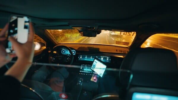 An Apollo Go user on a nighttime ride in a fully driverless vehicle