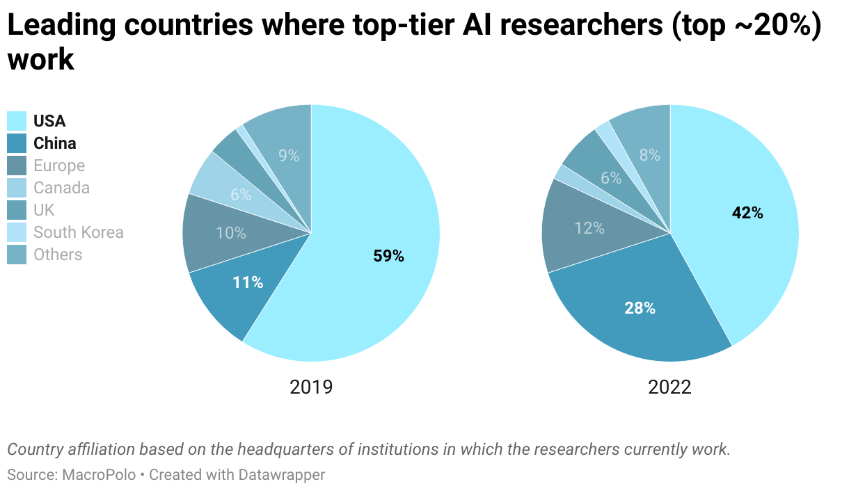 80% of AI researchers stay in the country where they completed their graduate degree. The US still attracts the most AI talent, but China's share is increasing.